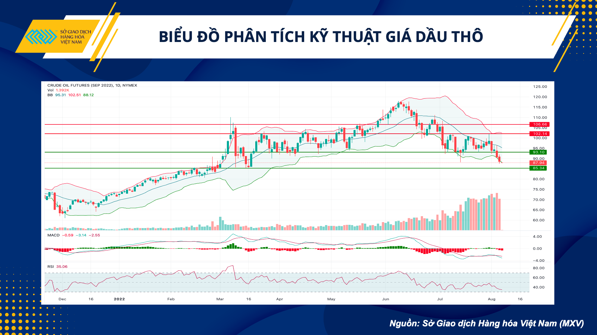 Trước diễn biến của thị trường thế giới, Sở Giao dịch hàng hoá Việt Nam có những phân tích kỹ thuật và khuyến nghị: Giá dầu WTI đã đánh mức các mốc hỗ trợ quan trọng là 93 USD, và hỗ trợ tâm lý 90 USD. Bollinger Band cũng đang mở rộng và hướng về phía dưới, với các chỉ số MACD và RSI tiếp tục cho thấy các tín hiệu tiêu cực. Nhà đầu tư có thể canh bán khi giá hồi lên 89,5 USD với kỳ vọng chốt lời ở mức 86 USD.
