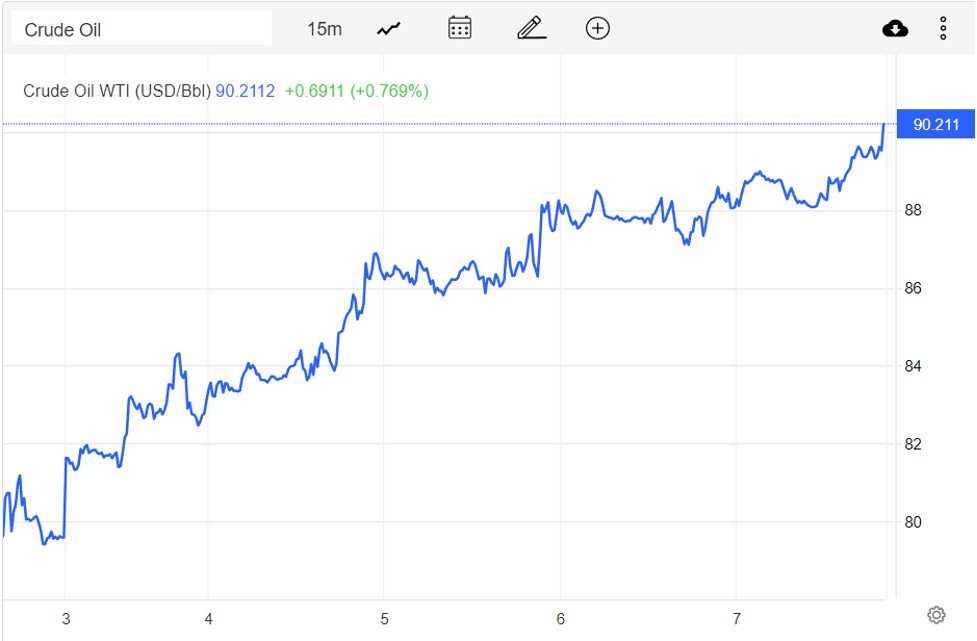 Theo Oilprice, giá dầu thế giới sáng ngày 8/10 (theo giờ Việt Nam) cụ thể là: Dầu thô WTI của Mỹ tiếp tục tăng mạnh 2,59 USD/thùng, lên mức 90,21 USD/thùng, giá dầu Brent cũng tăng mạnh 2,67 USD, lên mức 95,92 USD/thùng.