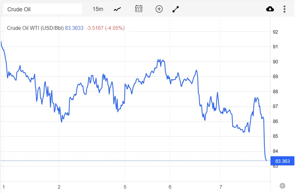 Giá xăng dầu thế giới sáng ngày 8/9 (theo giờ Việt Nam) cụ thể là: Dầu thô WTI của Mỹ giảm mạnh 3,9 USD/thùng, còn 83,36 USD/thùng. Dầu Brent cũng giảm mạnh 4,35 USD/thùng, xuống mức 89,42 USD/thùng.