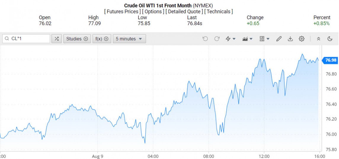 Ghi nhận trên Oilprice lúc 5h30 ngày 11/8/2024 (theo giờ Việt Nam), giá dầu WTI ở mốc 76,98 USD/thùng, tăng 0,85% (tương đương tăng 0,65 USD/thùng).