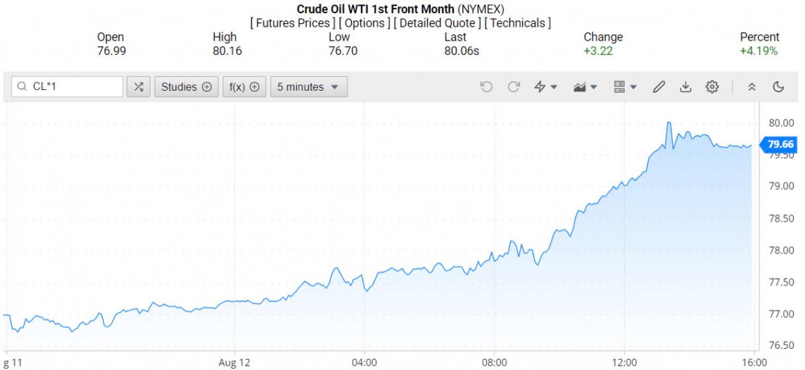 Ghi nhận trên Oilprice lúc 6h ngày 13/8/2024 (theo giờ Việt Nam), giá dầu WTI ở mốc 79,66 USD/thùng, tăng 4,19% (tương đương tăng 3,22 USD/thùng).
