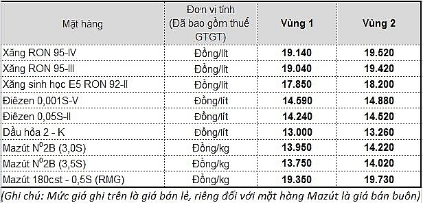 Với mức giá như vậy, Liên bộ quyết định điều chỉnh giá xăng E5RON92 tăng 129 đồng/lít; xăng RON 95 tăng 165 đồng/lít; dầu diesel giảm 158 đồng/lít; dầu hỏa giảm 169 đồng/lít; dầu mazut giảm 12 đồng/kg.