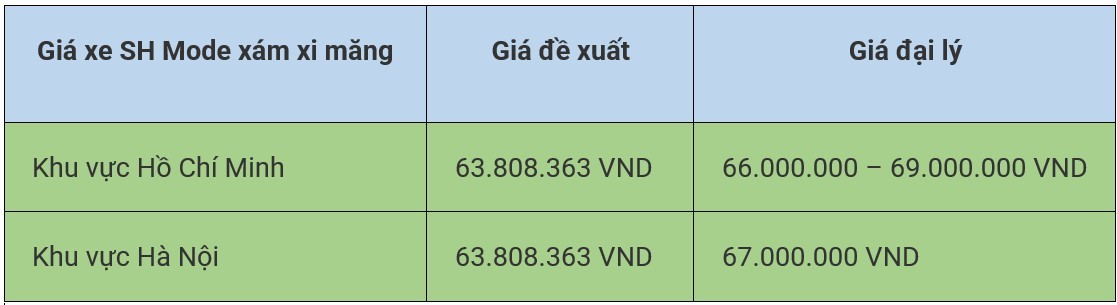 Theo đó tại khu vực TP. Hồ Chí Minh, giá xe SH Mode Xám xi măng trung bình sẽ dao động trong mức 66.000.000 – 69.000.000 triệu đồng.