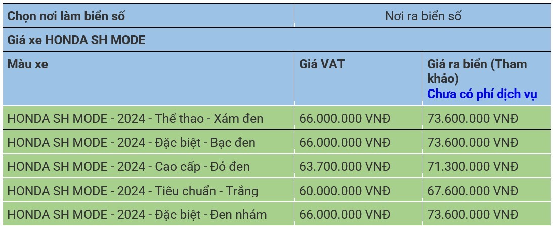 Tại khu vực Hà Nội, giá xe SH Mode thường rẻ hơn 1.000.000 đồng so với khu vực TP. Hồ Chí Minh. Tuy nhiên trong một số trường hợp khan hàng, xe được luân chuyển từ khu vực TP. Hồ Chí Minh nên giá xe sẽ bị tăng thêm chi phí vận chuyển khoảng 2.000.000 đồng