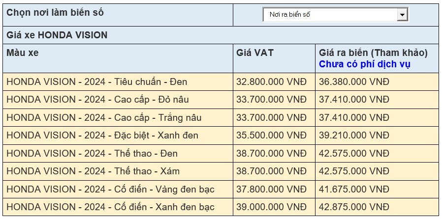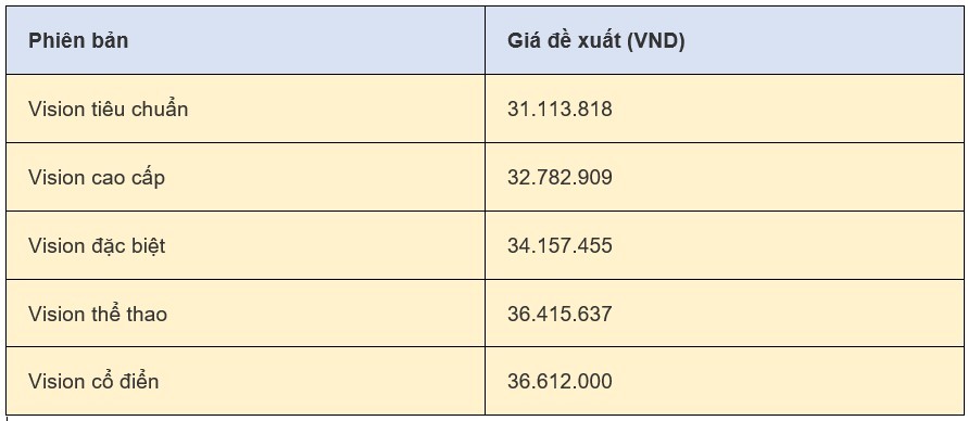 Đây là bảng giá lăn bánh Vision mới nhất 32.800.000 - 39.000.000 đồng (giá đã bao gồm thuế VAT, chưa có phí dịch vụ biển số).