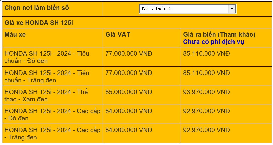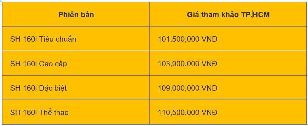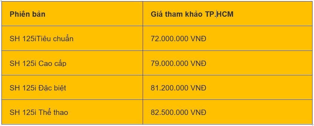 | Giá xe SH được tham khảo tại khu vực TP. Hồ Chí Minh |