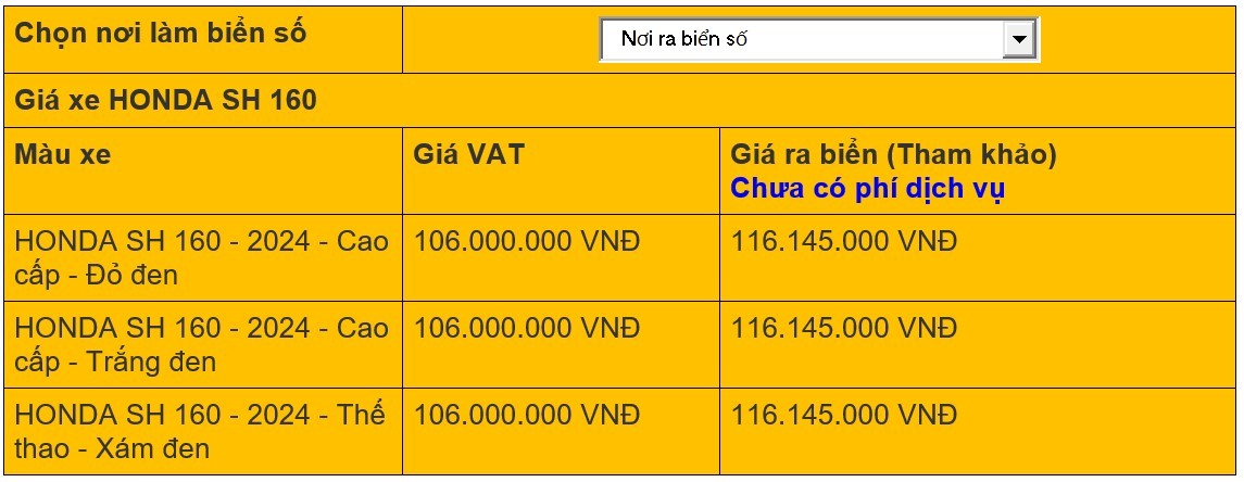 Do tình trạng thiếu hàng thường xuyên ở các phiên bản SH160i nên giá xe SH 2024 sẽ có nhiều mức và được trải dài từ 102 – 109 triệu đồng tại khu vực TP. Hồ Chí Minh, Hà Nội.