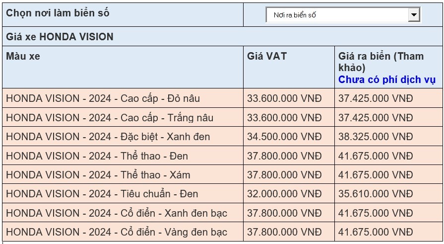 Đây là bảng giá lăn bánh Vision mới nhất 32.000.000 - 37.800.000 đồng, (giá đã bao gồm thuế VAT, chưa có phí dịch vụ biển số). Tùy vào mỗi nơi, địa phương sẽ có giá dịch vụ khác nhau.