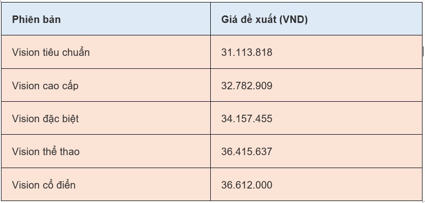 | Giá đề xuất bởi Honda Việt Nam, được công bố chính thức tại website: https://www.honda.com.vn/xe-may/san-pham/vision |
