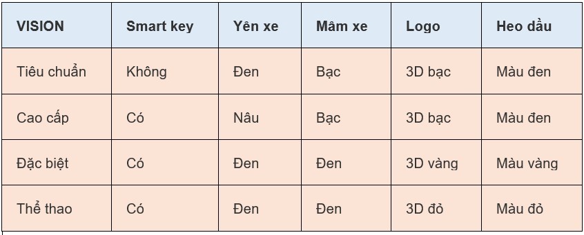 Xe tay ga Vision 2024 được chia làm 5 phiên bản chính: Tiêu chuẩn, cao cấp, đặc biệt, thể thao, cổ điển.