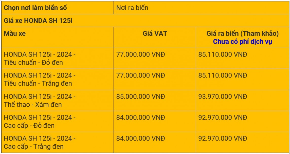 *Bảng giá xe SH 125i tại Honda Head tại TP. Hồ Chí Minh mới nhất ngày 10/6/2024: