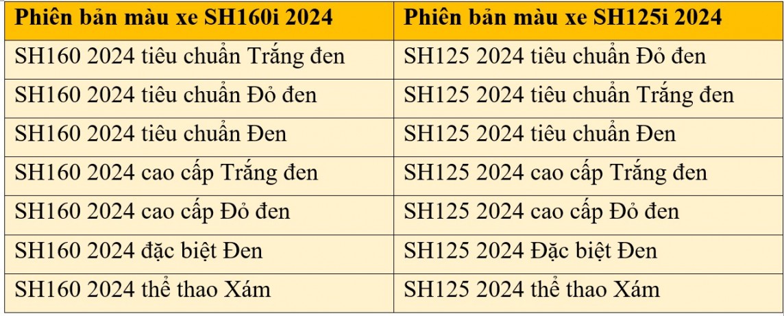 Phiên bản màu xe SH125i/SH160i 2024 |