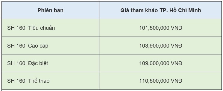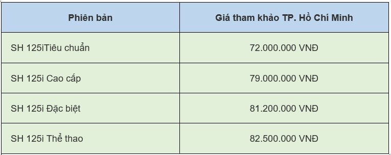 | Giá xe SH được tham khảo tại khu vực TP. Hồ Chí Minh |