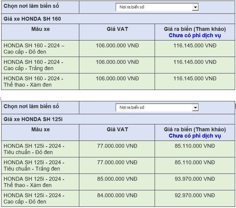 Do tình trạng thiếu hàng thường xuyên ở các phiên bản SH160i nên giá xe SH 2024 sẽ có nhiều mức và được trải dài từ 102 – 109 triệu đồng tại khu vực Hồ Chí Minh, Hà Nội.