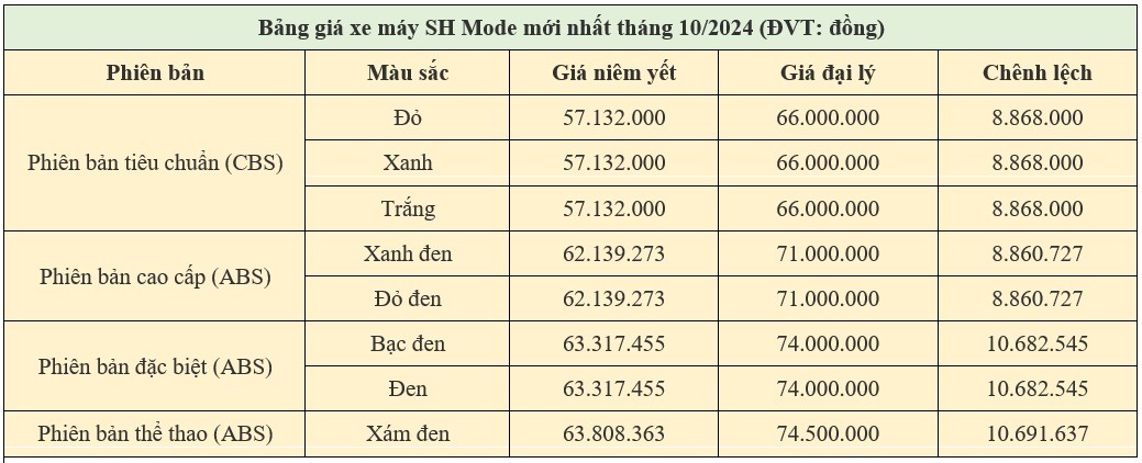 Dưới đây là bảng giá xe Honda SH Mode mới nhất tháng 10/2024: