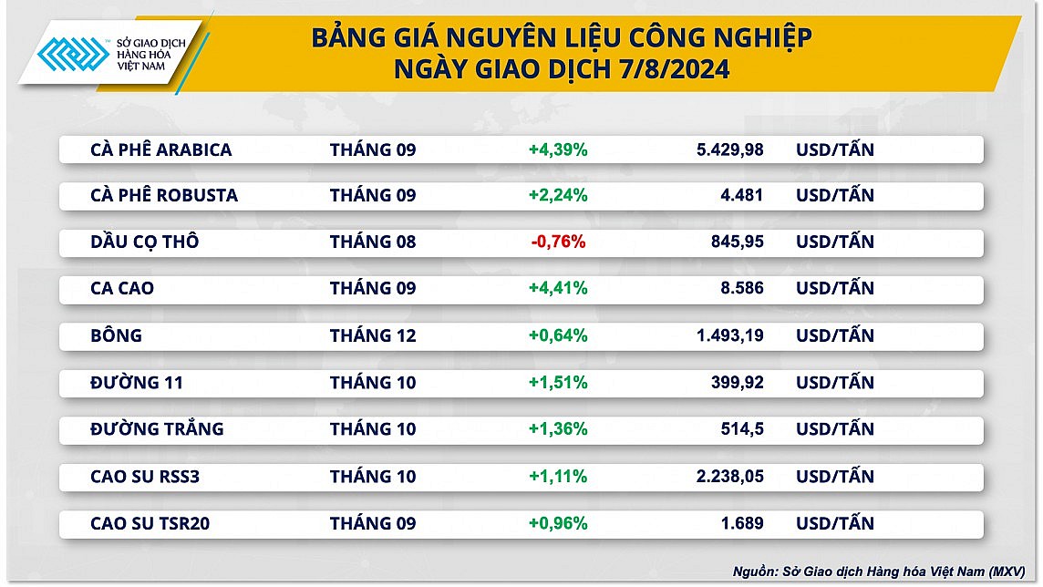 Theo Sở Giao dịch hàng hoá Việt Nam (MXV), kết phiên giao dịch 7/8, giá hai mặt hàng cà phê tiếp đà tăng mạnh. Cụ thể, giá cà phê Arabica nhảy vọt 4,39% lên 5.429,98 USD/tấn, thiết lập mức cao nhất trong ba tuần; giá cà phê Robusta cũng cao hơn 2,24% so với tham chiếu, lên gần 4.500 USD/tấn. Tỷ giá USD/BRL thu hẹp và lo ngại nhiệt độ giảm tại Brazil đã đẩy giá đi lên.