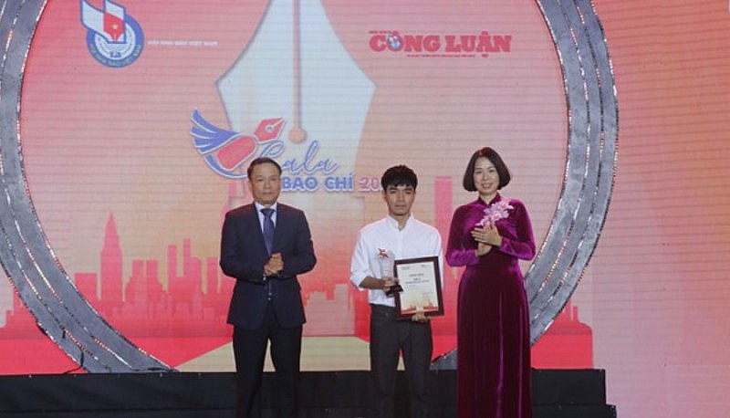 | Bà Vũ Việt Trang, Bí thư Đảng ủy, Tổng Giám đốc Thông tấn xã Việt Nam (phải) và ông Nguyễn Đức Lợi, Phó Chủ tịch Thường trực Hội Nhà báo Việt Nam (trái) trao giải A cho tác giả Đinh Đức Long (Báo Dân Trí) |