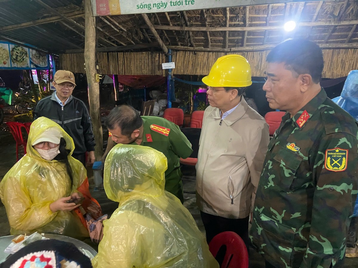 | Ông Nguyễn Tấn Tuân - Chủ tịch UBND tỉnh Khánh Hòa (mũ vàng) thăm hỏi, động viên những người bị mắc kẹt trên đèo Khánh Lê được giải cứu tối 15/12. Ảnh: Bùi Kỳ |