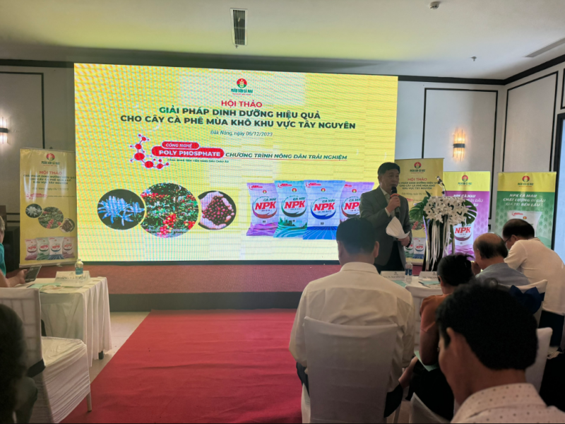 Sáng ngày 6/12/2023, tại Đắk Nông, Công ty Cổ phần Phân bón Dầu khí Cà Mau phối hợp các Nhà phân phối tổ chức Hội thảo kỹ thuật, tọa đàm với chủ đề “Giải pháp dinh dưỡng hiệu quả cho cây cà phê mùa khô khu vực Tây Nguyên - Chương trình nông dân trải nghiệm NPK Cà Mau - Công nghệ Polyphosphate”.