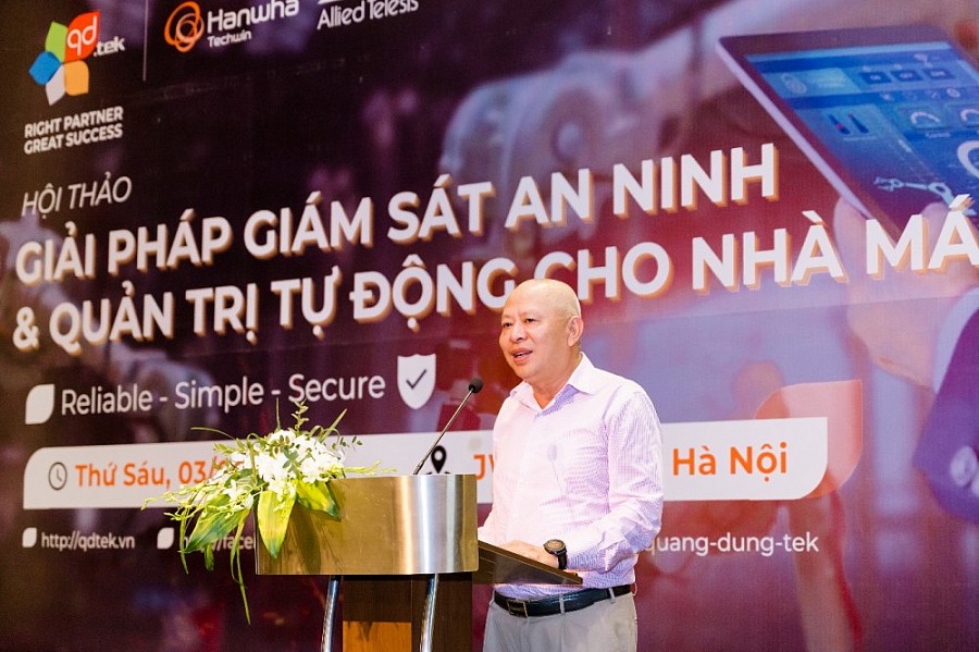 Đại diện QD.TEK, ông Tôn Tích Phương - Thành viên HĐQT, Tổng giám đốc cho biết: “Với kinh nghiệm hơn 18 năm phân phối các sản phẩm, giải pháp công nghệ thông tin tổng thể và cơ sở hạ tầng tối ưu và sự am hiểu về nhu cầu khách hàng, QD.TEK cùng chung với các đối tác hàng đầu thế giới như Hanwha Techwin, Allied Telesis, Vertiv, CommsCope mang đến hội thảo chuyên đề lần này với những xu hướng 4.0 nhất dành riêng cho lĩnh vực nhà máy, qua đó giúp các nhà tích hợp, nhà thầu cơ điện có thể đem đến cho khách hàng của mình các giải pháp quản trị tự động tăng hiểu quả, giảm chi phí, đảm bảo an ninh và bảo mật hệ thống thông qua giải pháp toàn diện, dự phòng nguồn điện, duy trì hoạt động hệ thống và an toàn dữ liệu."