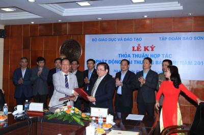 | Thứ trưởng Bộ GD&ĐT Bùi Văn Ga (bên phải) và Chủ tịch Tập đoàn Bảo Sơn Nguyễn Trường Sơn ký kết thỏa thuận hợp tác |