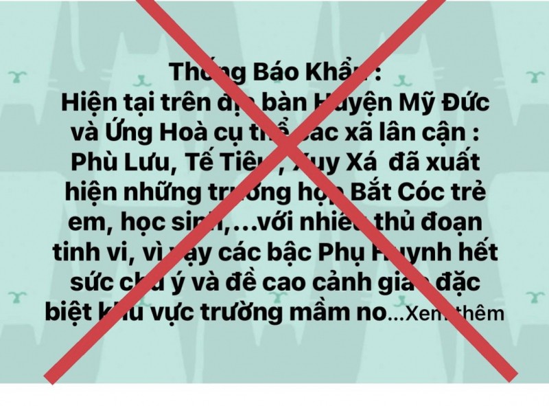 Liên quan đến việc cư dân mạng bàn tán về thông tin bắt cóc trẻ em, Công an Hà Nội vừa thông tin hiện nay trên các trang mạng xã hội đăng tải thông tin: “Thông báo khẩn: Hiện tại trên địa bàn huyện Mỹ Đức và Ứng Hòa cụ thể các xã lân cận: Phù Lưu, Tế Tiêu, Xuy Xá đã xuất hiện những trường hợp Bắt cóc trẻ em, học sinh… với nhiều thủ đoạn tinh vi, vì vậy, các bậc Phụ Huynh hết sức chú ý và đề cao cảnh giác đặc biệt khu vực trường mầm non…”.