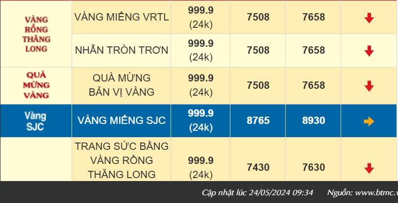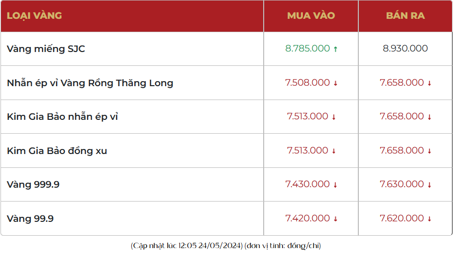 Cùng với đà giảm của giá vàng SJC, giá vàng nhẫn 999.9 cũng giảm mạnh theo với các mức giá tùy từng doanh nghiệp. Cụ thể, nhẫn ép vỉ Vàng Rồng Thăng Long, nhẫn ép vỉ Kim Gia Bảo của Công ty Bảo Tín Mạnh Hải hiện giao dịch ở mức 75,08 - 76,58 triệu đồng/lượng mua vào - bán ra, giảm 550 ngàn đồng/lượng chiều mua và giảm 450 ngàn đồng/lượng chiều bán so với ngày hôm qua.