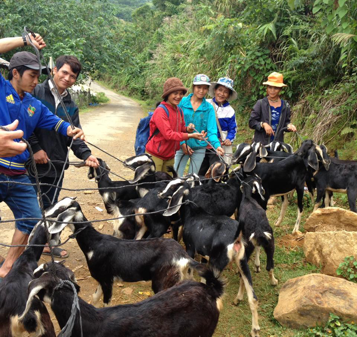 | Niềm vui của người dân huyện Nam Trà My (Quảng Nam) khi được nhận dê giống do dự án hỗ trợ |