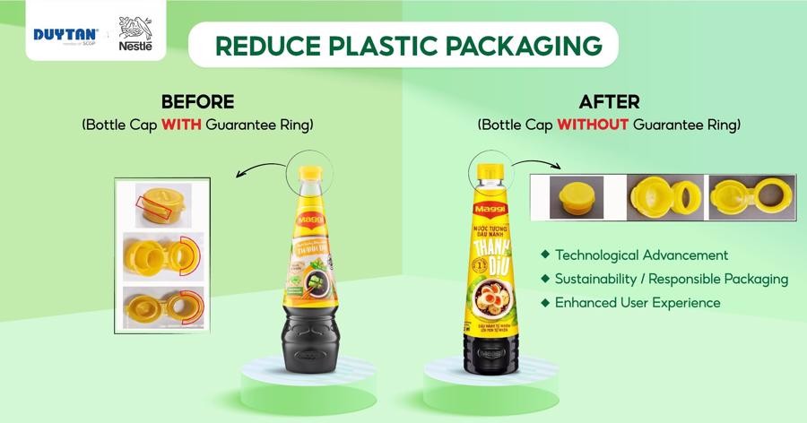 Một cải tiến nổi bật khác của Nhựa Duy Tân trong năm 2021 là nắp chai nước tương, dầu hào nhãn hiệu Maggi của Tập đoàn Nestlé Việt Nam. Với đề bài: Giảm nhựa trong nắp chai mà vẫn đảm bảo chất lượng và sự tiện dụng cho người tiêu dùng, Nhựa Duy Tân đã triển khai dự án và sản xuất hàng loạt sản phẩm ra thị trường.
