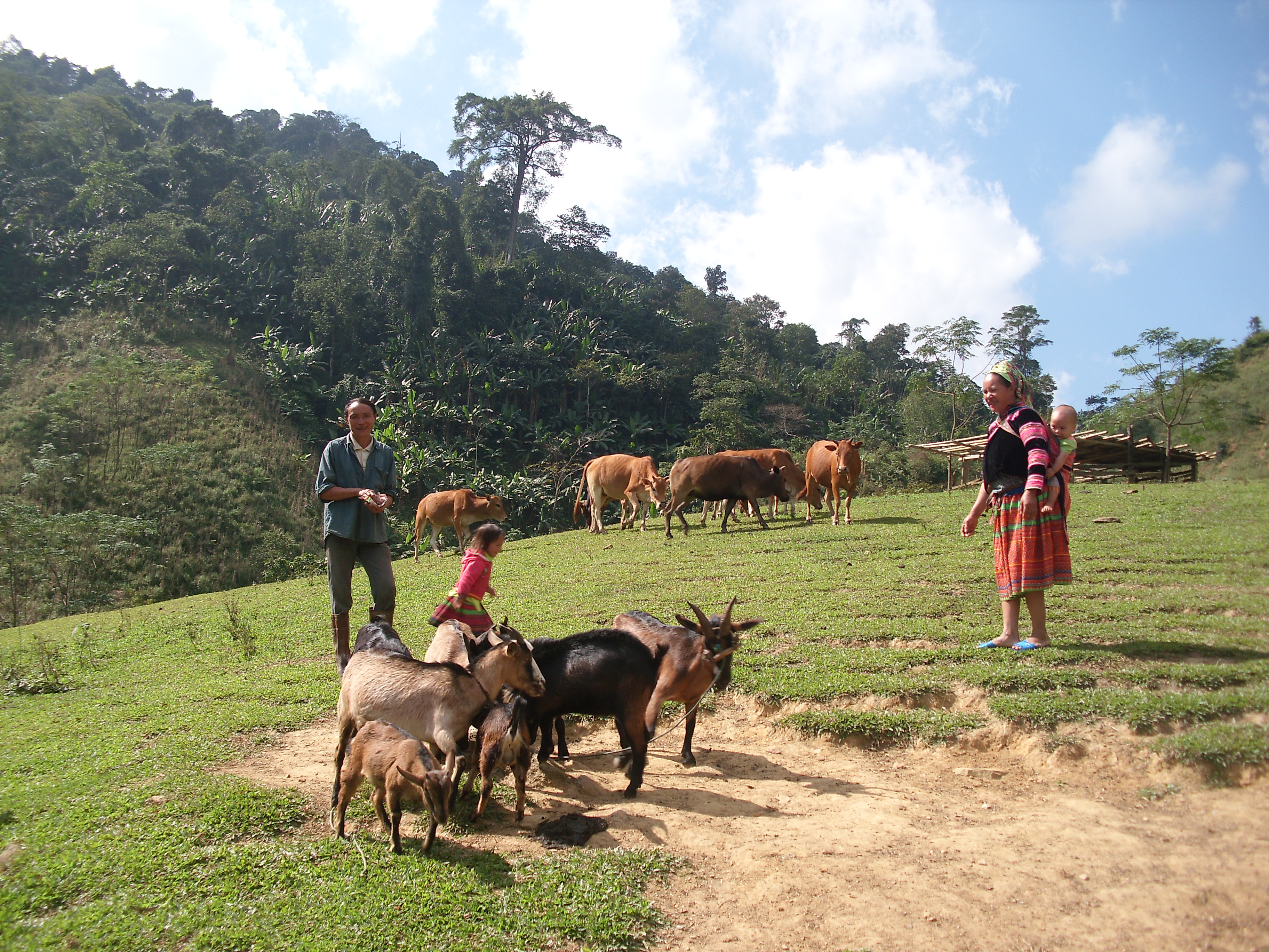 | Vợ chồng anh Lử, chị Cá chăm sóc đàn gia súc của gia đình |