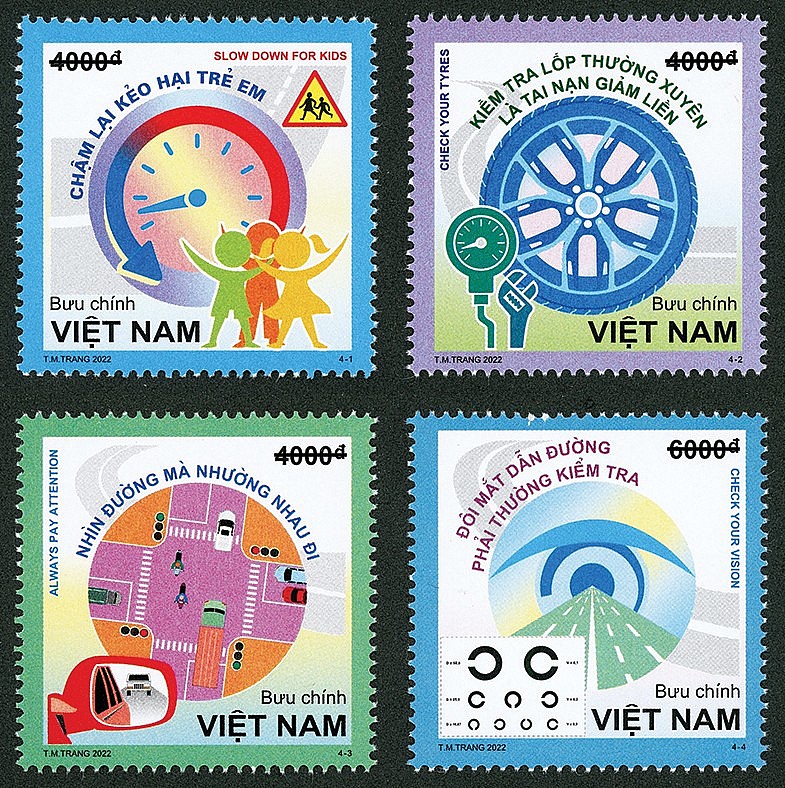 Bộ tem “An toàn giao thông đường bộ (bộ 3)” gồm 04 mẫu có giá mặt 4.000đ, 4.000đ, 4.000đ và 6.000đ, khuôn khổ 37 x 37 (mm) do họa sỹ Tô Minh Trang thiết kế, được cung ứng trên mạng bưu chính từ ngày 20/9/2022 đến ngày 30/6/2024.