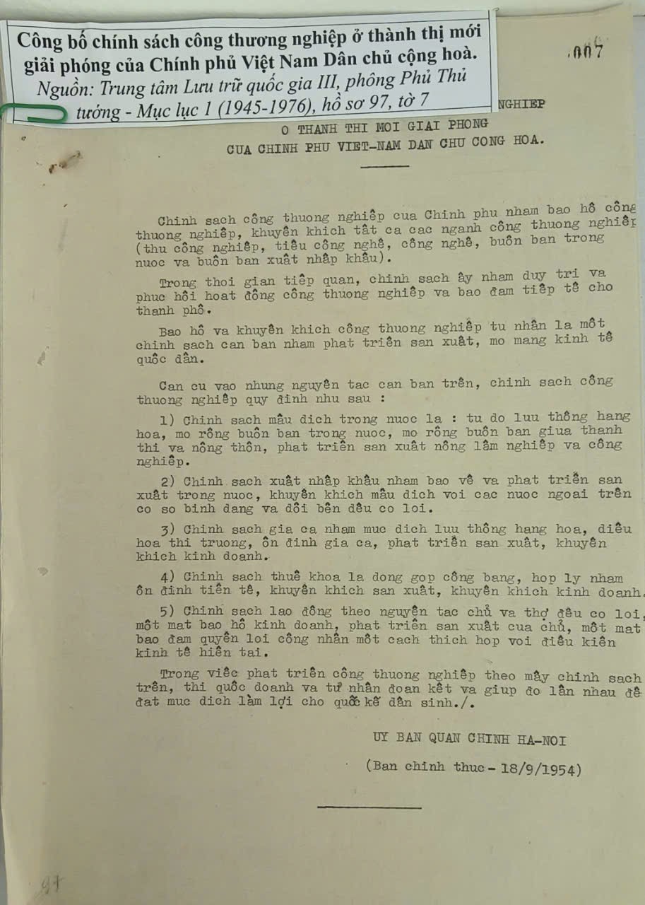 | Công bố chính sách công thương nghiệp ở thành thị mới giải phóng của Chính phủ nước Việt Nam Dân chủ Cộng hoà. Ảnh: Quang Lộc |
