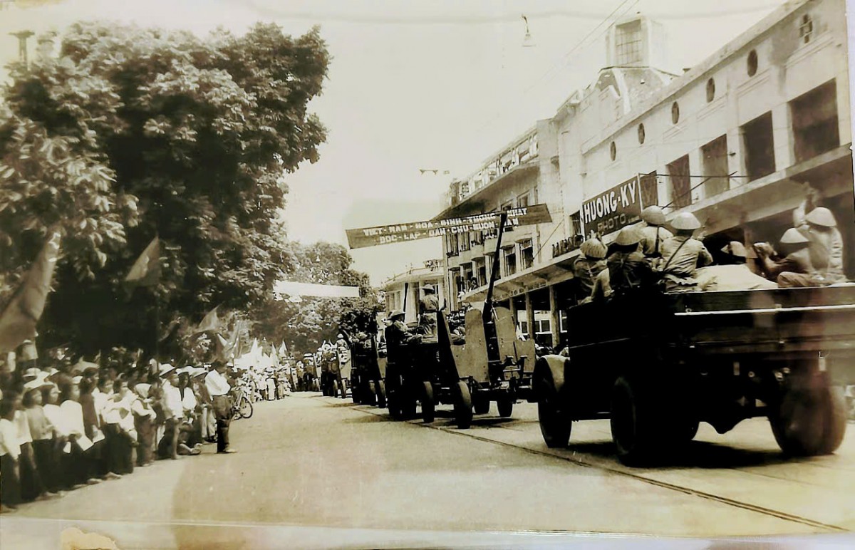 | Các đơn vị của Quân đội nhân dân Việt Nam tiến về Hà Nội trong sự hân hoan chào đón của nhân dân (trong ảnh là tuyến phố Hàng Bài - Đinh Tiên Hoàng). Ảnh: Quang Lộc |
