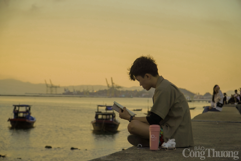 | Có thói quen mỗi chiều đều đến khu vực bờ kè dưới chân cầu Thuận Phước đọc sách, ngắm hoàng hôn, bạn Võ Xuân Thân (23 tuổi, trú quận Hải Châu) chia sẻ: "Ngồi trước biển cả và lắng nghe tiếng sóng vỗ vào bãi đá, ngắm nhìn tia nắng buông xuống vào cuối ngày tạo cho mình cảm giác thư thái". |
