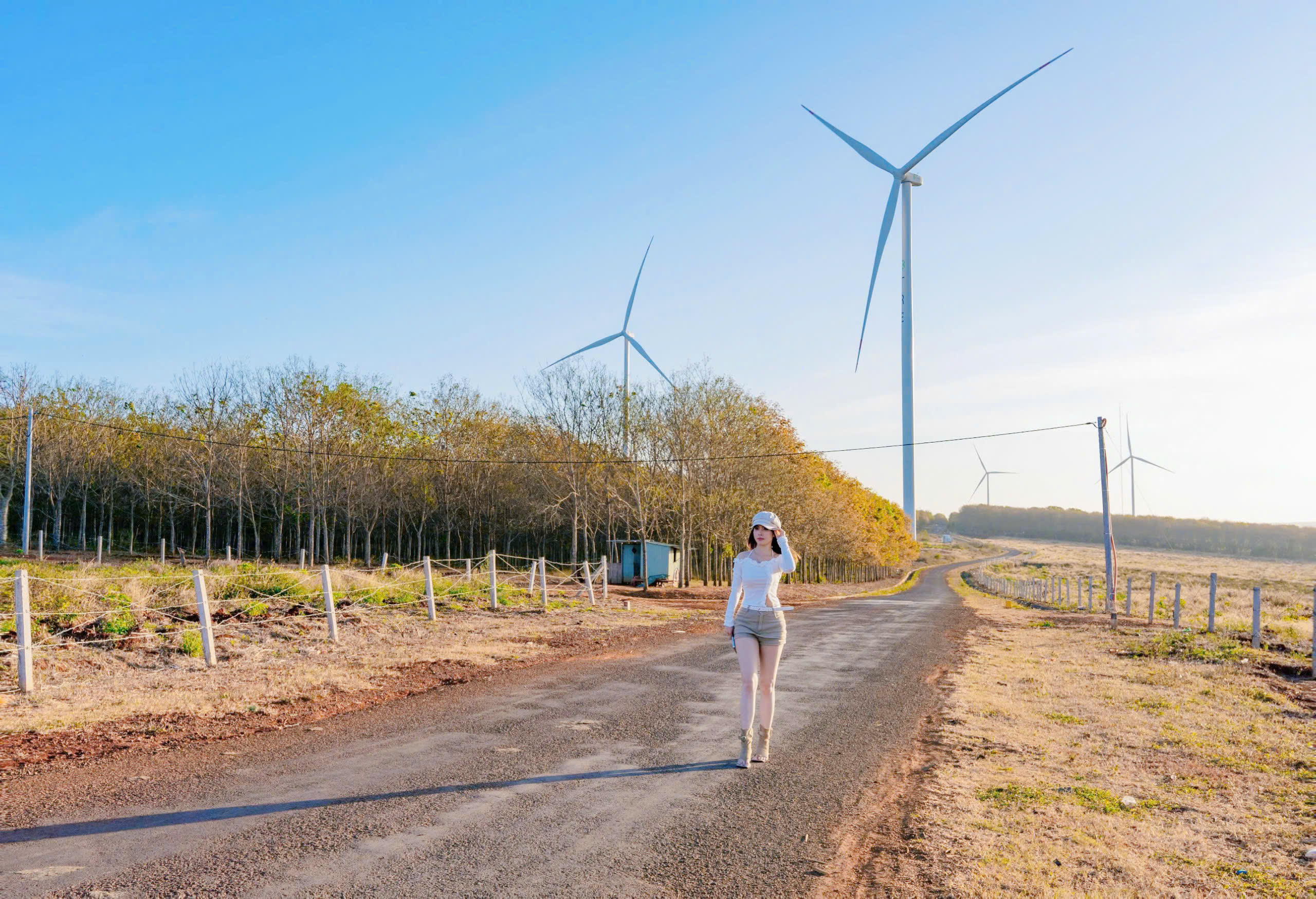 Trong tiết trời se lạnh, nắng vàng trải nhẹ trên những triền đồi, hàng chục trụ tua-bin gió trắng muốt vươn cao giữa không gian xanh thẳm, tạo nên khung cảnh được ví như một góc trời châu Âu giữa Tây Nguyên.