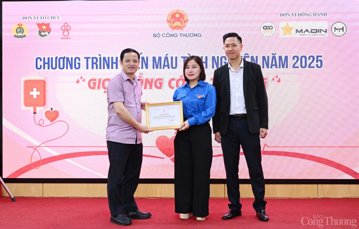 Viện Huyết học - Truyền máu Trung ương đã trao tặng Đoàn Thanh niên Bộ Công Thương chứng nhận đơn vị có thành tích xuất sắc trong công tác tuyên truyền, vận động, tham gia hiến máu tình nguyện.