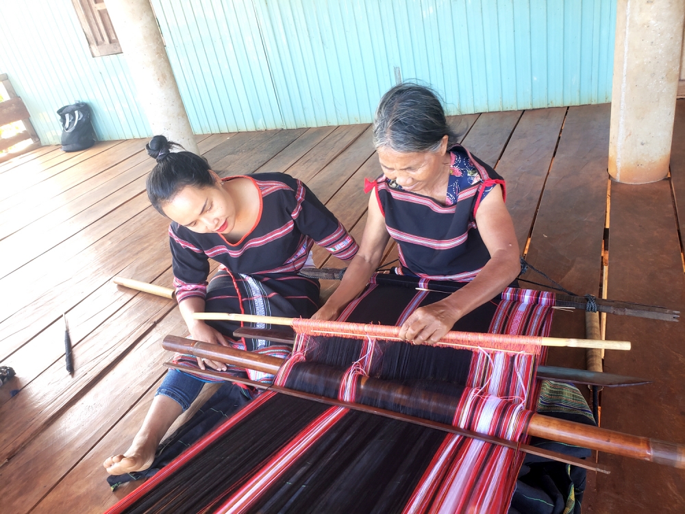 Bà Rơ Châm Mir (69 tuổi) kể rằng bà không biết nghề dệt thổ cẩm của đồng bào Jrai có từ khi nào. Chỉ biết, từ khi còn ẵm ngửa đến khi biết bò, biết nhận thức về hình ảnh thì bà đã thấy các bà, các mẹ, các dì dệt vải ở mọi lúc, mọi nơi… “Mùa thu hoạch xong rồi thì dệt vải là một niềm vui khi ở nhà trông con, trông cháu” - bà Rơ Châm Mir chia sẻ.