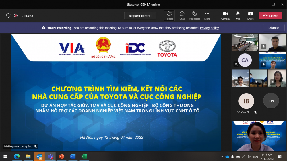 Ngày 12/4/2022, Trung tâm Hỗ trợ phát triển công nghiệp (Trung tâm IDC), Cục Công nghiệp - Bộ Công Thương và Công ty Ô tô Toyota Việt Nam phối hợp tổ chức Toạ đàm trực tuyến “Chương trình tìm kiếm và kết nối các nhà cung cấp của Cục Công nghiệp và Toyota”, trong khuôn khổ Dự án hợp tác hàng năm giữa Cục Công nghiệp và Công ty Ô tô Toyota Việt Nam từ 2020 nhằm hỗ trợ các doanh nghiệp Việt Nam trong lĩnh vực CNHT ô tô.