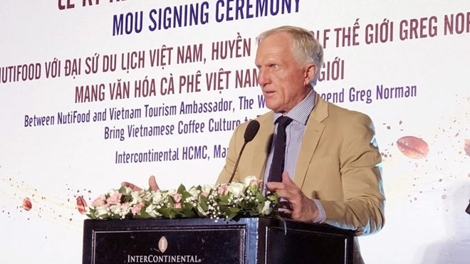 | Golf legend Greg Norman - Tourism Ambassador of Vietnam for 2018-2021 - speaks at the MoU signing ceremony in HCM City - Photo: VNA |