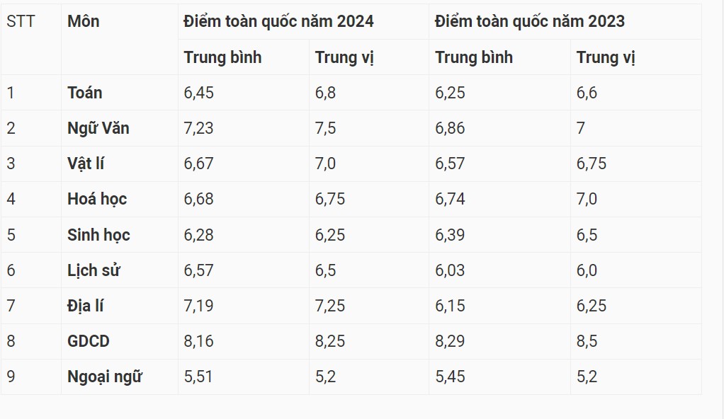 Theo Cục Quản lý chất lượng - Bộ Giáo dục và Đào tạo đánh giá, nhìn chung, phổ điểm của các môn thi tốt nghiệp THPT năm 2024 vẫn giữ được sự ổn định và tương đồng với phổ điểm năm 2023 và các năm trước. Điểm trung bình và trung vị của các môn thi trên toàn quốc được giữ ổn định và tương đồng so với năm 2023, thể hiện ở bảng thống kê sau: