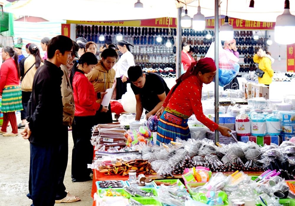 | Người dân huyện Mèo Vạc phấn khởi đi mua sắm tại phiên chợ đưa hàng Việt về miền núi (Nguồn: Sở Công Thương Hà Giang) |