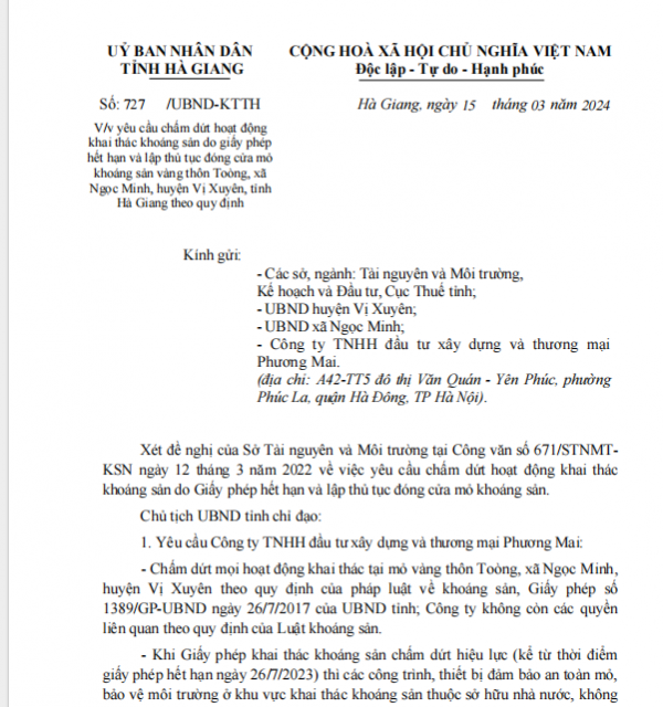 Cụ thể, Thường trực Ủy ban Nhân dân tỉnh Hà Giang yêu cầu Công ty Trách nhiệm Hữu hạn Đầu tư Xây dựng và Thương mại Phương Mai (địa chỉ A42-TT5 đô thị Văn Quán, Yên Phúc, phường Phúc La, Quận Hà Đông, Hà Nội) chấm dứt mọi hoạt động khai thác tại mỏ vàng thôn Toòng, xã Ngọc Minh, huyện Vị Xuyên theo quy định của pháp luật về khoáng sản, Giấy phép số 1389/GP-UBND ngày 26/7/2017 của Ủy ban Nhân dân tỉnh Hà Giang; Công ty không còn các quyền liên quan theo quy định của Luật khoáng sản.