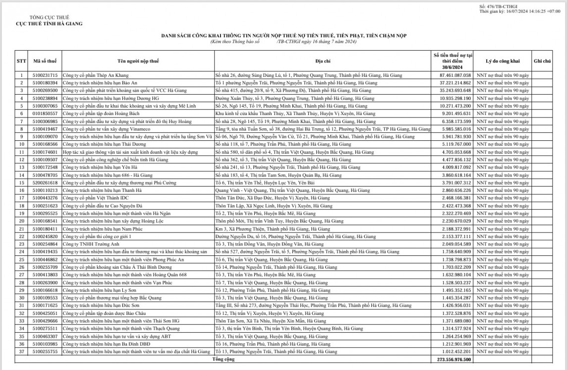 Theo đó, Cục Thuế tỉnh Hà Giang thực hiện công khai thông tin 37 người nộp thuế còn nợ tiền thuế, tiền phạt và tiền chậm nộp có số tiền thuế nợ trên 90 ngày tại thời điểm 30/6/2024 với số tiền là: 273.556.976.500 đồng (hơn 273 tỷ đồng).