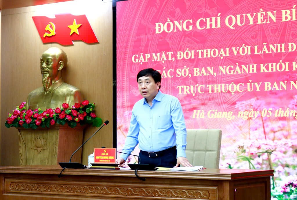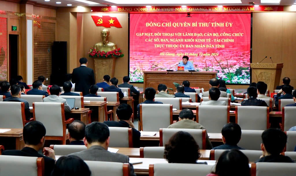 Quyền Bí thư Tỉnh ủy Hà Giang Nguyễn Mạnh Dũng đã có buổi gặp mặt, đối thoại trực tiếp với lãnh đạo, công chức các sở, ban, ngành khối kinh tế - tài chính trực thuộc Ủy ban nhân dân tỉnh Hà Giang nhằm nắm bắt tình hình, lắng nghe tâm tư, nguyện vọng, đề xuất, kiến nghị của cán bộ, công chức các sở, ngành thuộc lĩnh vực tài chính - kinh tế. Tham gia buổi đối thoại có lãnh đạo các Ban xây dựng Đảng Tỉnh ủy, lãnh đạo và cán bộ, chuyên viên các sở, ban, ngành của địa phương.