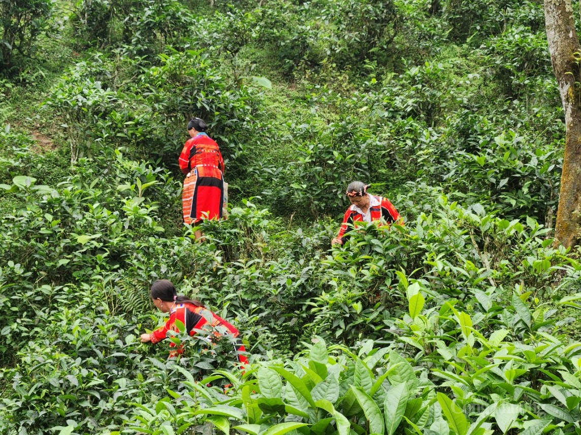 | Các hội viên trong thôn Thượng Bình tham gia hái chè, cùng chia sẻ kinh nghiệm phát triển kinh tế |