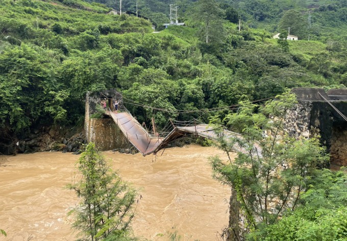 | Người dân không thể di chuyển qua cầu treo Hạ Sơn thuộc xã Thành Thủy, huyện Vị Xuyên do ảnh hưởng của mưa lũ nước dâng lên đã bị phá hủy mặt cầu. |
