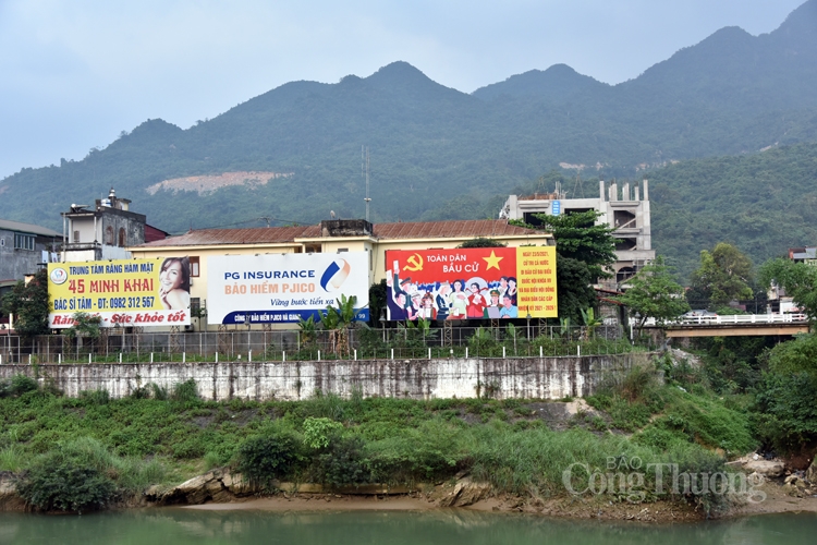 | Bên bờ sông Lô, chân cầu Yên Biên cũng lắp đặt những tấm pa nô lớn |
