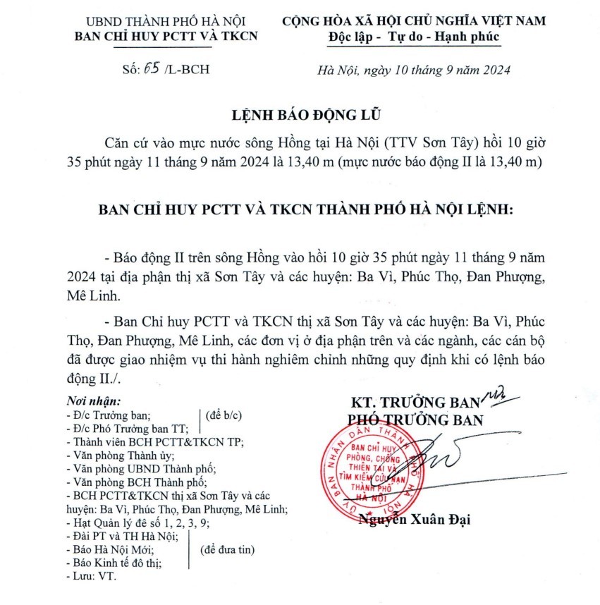Ban Chỉ huy PCTT và KTCN thành phố Hà Nội lệnh: Báo động II trên sông Hồng hồi 10 giờ 35 phút ngày 11 tháng 9 tại địa phận thị xã Sơn Tây và các huyện Ba Vì, Phúc Thọ, Đan Phượng, Mê Linh.