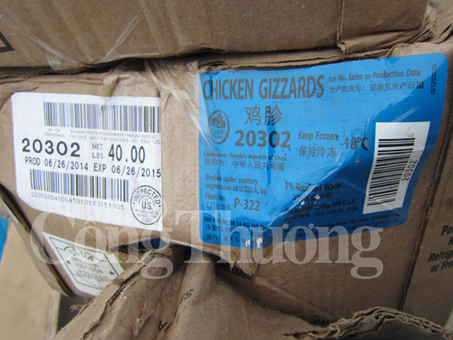 | Kiểm tra bao bì, lực lượng chức năng ghi nhận hàng chục thùng chân gà nhập khẩu đã hết hạn sử dụng từ tháng 6/2015 và có những thùng hết hạn từ tháng 8/2014 |