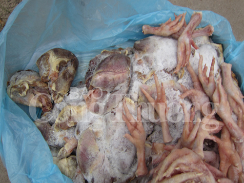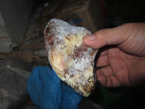 | Khoảng 1 tấn các sản phẩm động vật như tim lợn, chân gà, mề gà đã quá hạn sử dụng được để trong 3 kho đông lạnh của công ty |